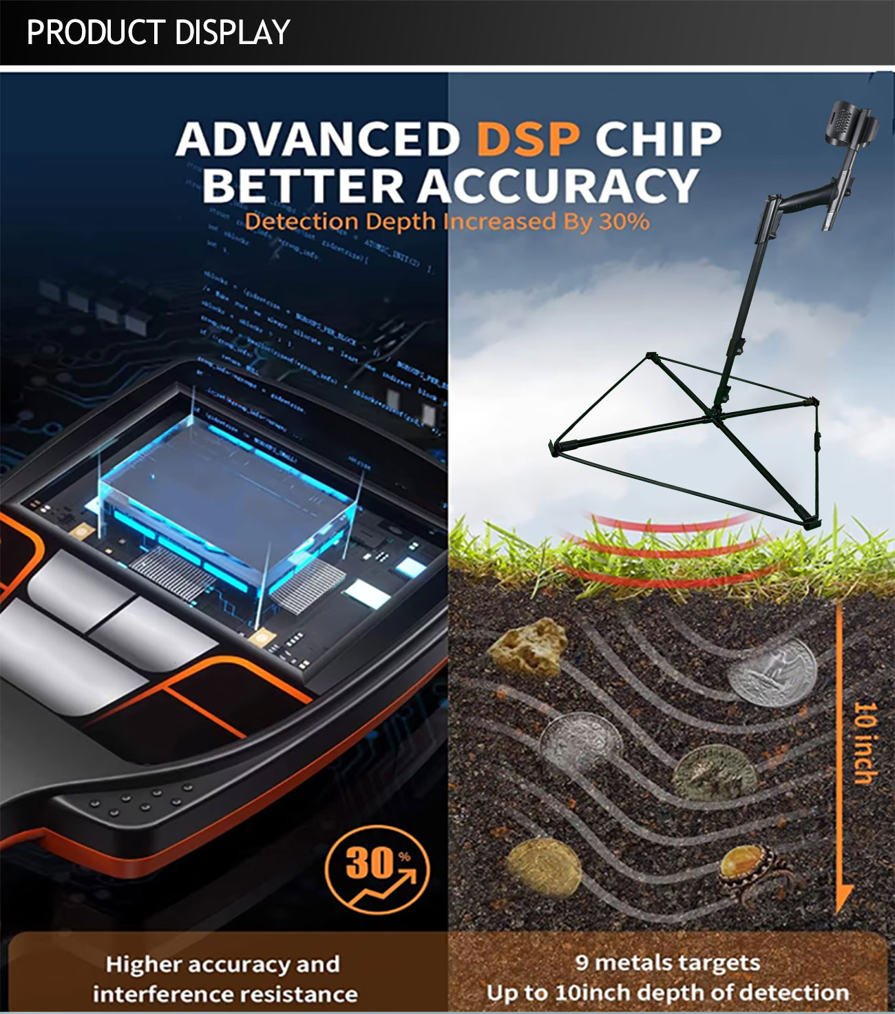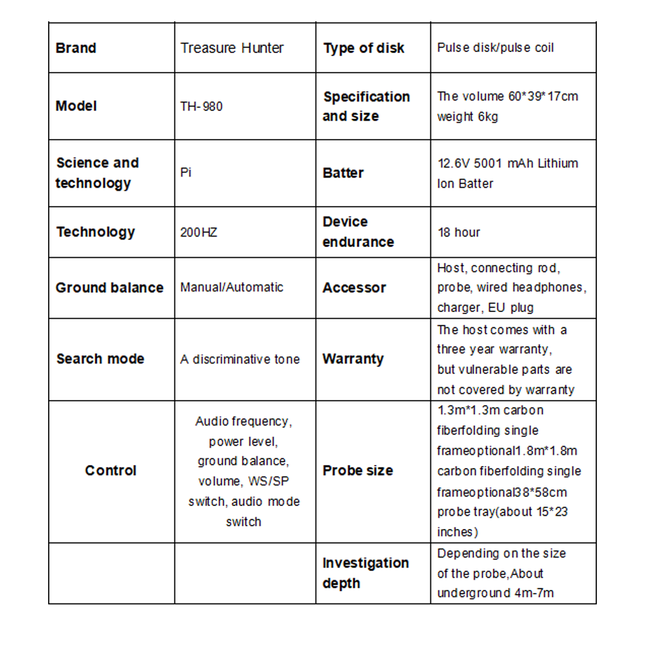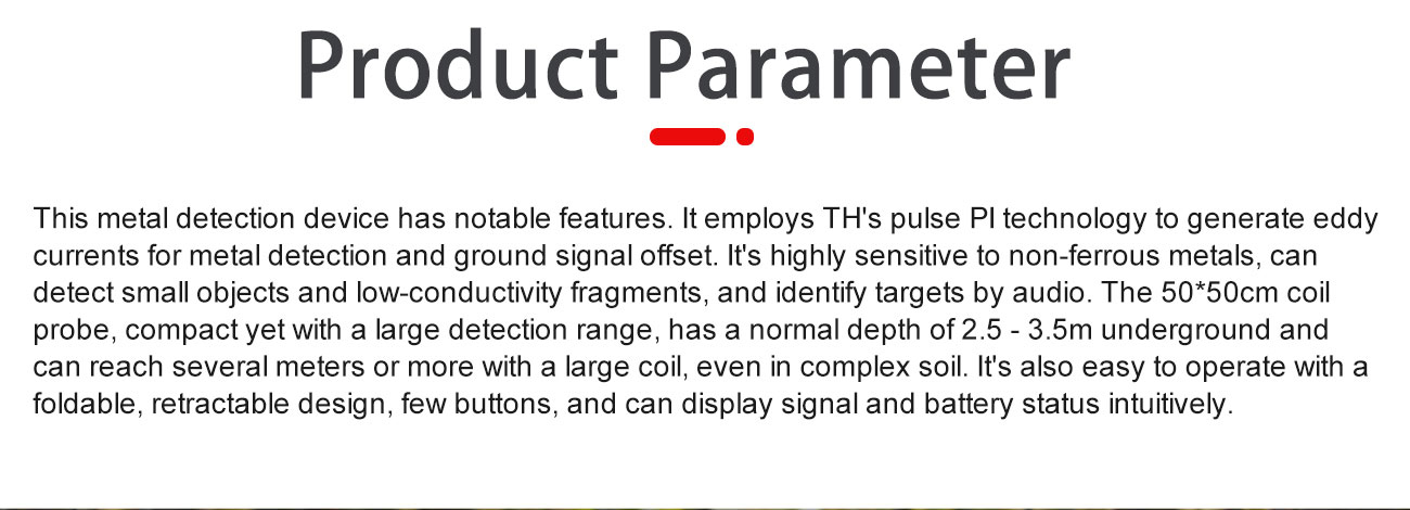 This metal detection device has notable features. lt employs TH’s pulse Pl technology to generate eddycurrents for metal detection and ground signal offset. it’s highly sensitive to non-ferrous metals, candetect small objects and low-conductivity fragments, and identify targets by audio. The 50*50cm coilprobe, compact yet with a large detection range, has a normal depth of2.5 – 3.5m underground andcan reach several meters or more with a large coil, even in complex soil. it’s also easy to operate with afoldable, retractable design, few buttons, and can display signal and battery status intuitively.