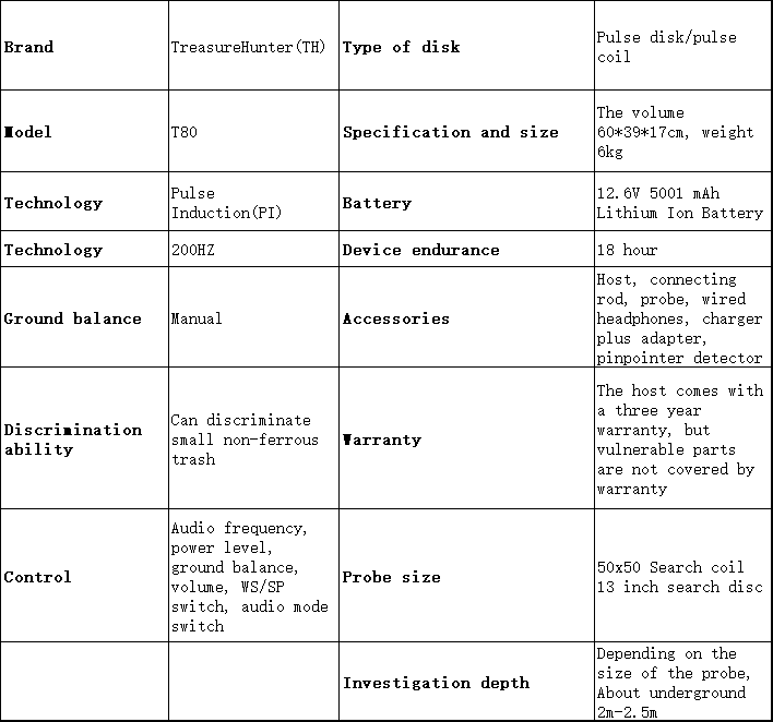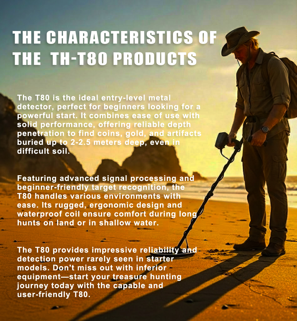 Designed as the ideal entry-level metal detector, the TH-T80 combines beginner-friendly operation with professional-grade power. Capable of detecting gold, coins, and artifacts buried up to 2-2.5 meters deep, it features advanced signal processing to handle difficult soil conditions with ease. With its rugged, ergonomic design and a waterproof search coil, you can search comfortably on land or in shallow water. Don’t settle for less—begin your journey with the reliable and capable TH-T80 today.